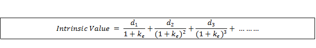 If we write this mathematically, let dt be the dividend to be paid t years from now, and let ke be the discount rate to calculate the present value. Then, the intrinsic value is: